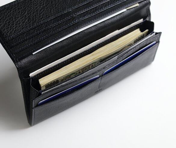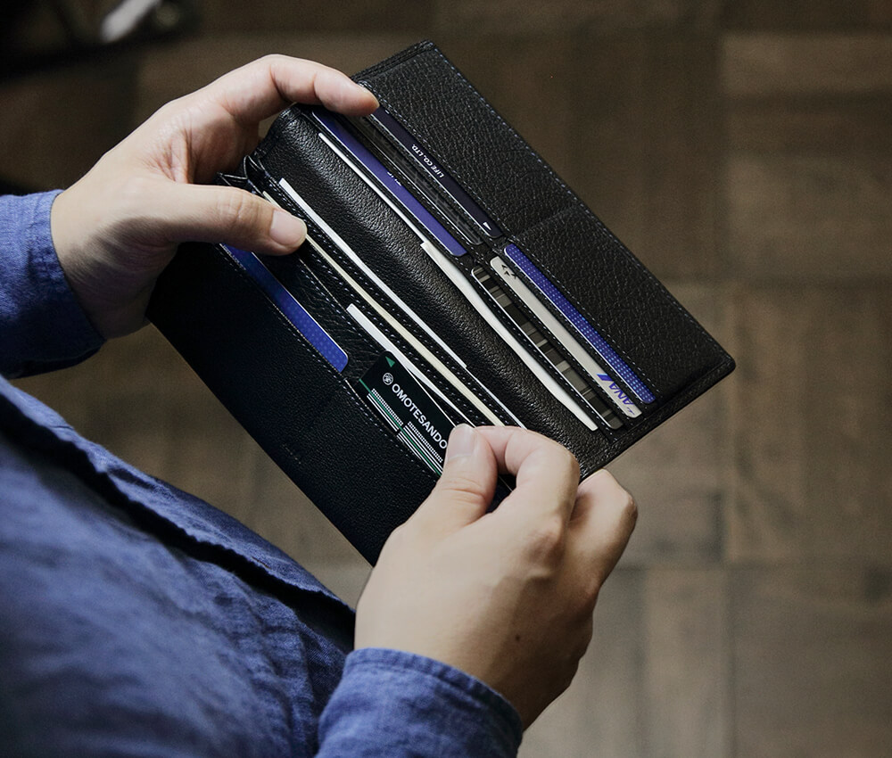 この風琴マチの凄いところは見た目以上に収納力があるところだ。たとえば札入れとフリーポケットは合計すると4つあり、紙幣ごとに収納箇所を分けることが可能なほどだ。更にカード段も8カ所あるので必要なカードは大抵収納可能だ。また、フリーポケットは使い方次第で如何様にも応用が利く。但し、全てのポケットにたっぷりと収納してしまうと長財布がボテッとした見た目になってしまうので、格好よさが際立つスリムな状態にして持つことをお勧めしたい。