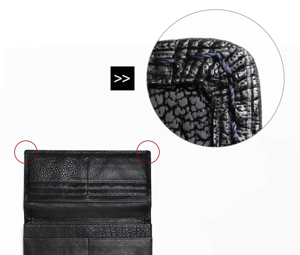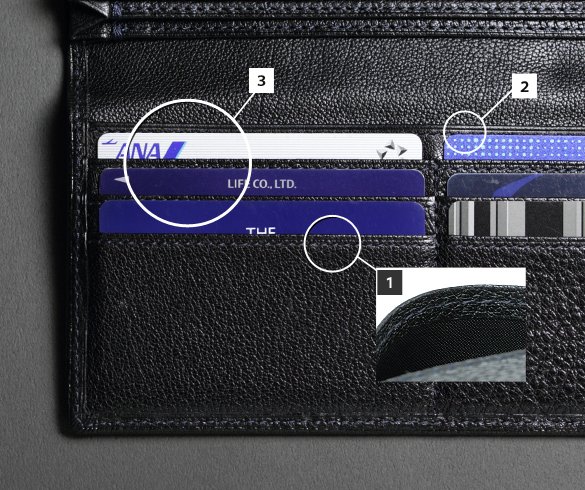 革は使っていくと柔らかくなる。また、柔らかい革は相対的に伸びやすい。だが、カード段の革が伸びてしまうとカブセを開けた瞬間にカードが落下してしまったり、切れてしまったりと不都合が多い。そんなリスクを最小限にするためにカード段には「へり返し」を施し、さらにその上からステッチをかけるひと手間を加えている(※右図1)。これは長く使い続けるための工夫だ。また、カード段をよく見るとピリッと引き締まったネンが引いてあり(※右図2)、またカードの頭も綺麗に揃っている(※右図3)。こういったところにもAlt81の考え方は息づいている。