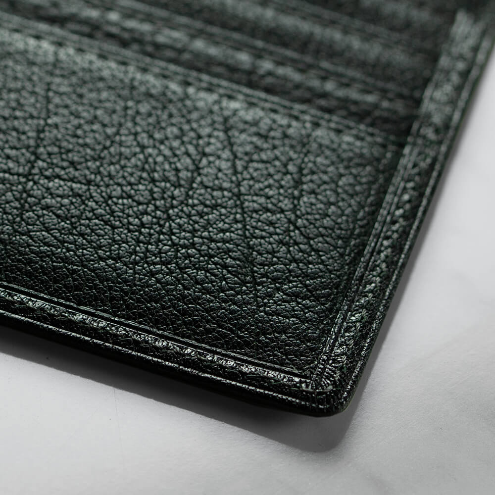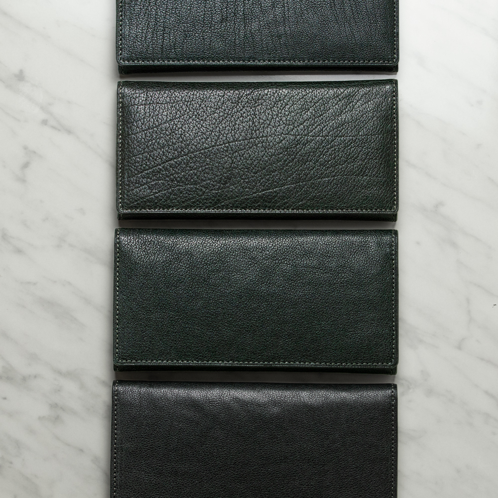 P&Dバッファローカーフには2つの色が存在する。1つはブラック。定番の色だがこの革のシボと光沢感が相まってグッと引き締まった印象を与えてくれる。もう1つはグリーン。こちらは少しシックで大人が持つにふさわしい色合いとなっている。どちらにするか、誘惑は尽きない。