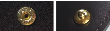 滅多にお目にかかることのない”ホックの名刺入れ”。アクセントにもなっているこのホックにもAlt81のこだわりが散りばめられている。ホックのメス(受け側)にはドイツ・プリム社製を、オス(突起側)の金具は日本製の真鍮削り出しの挽物を用意。挽物とは金属の塊から削り出して作る方法で、丈夫で綺麗、そして重厚感がある。ホックを留めた際に響く「パチッ」という乾いた高音は真鍮挽物ならではといえる。また、ホックのアタマにも注目して欲しい。ネイビーとグリーンには黒ニッケルメッキの表面に職人が細かく線を入れ艶を消す「サテー加工」を施したものを、ダークブラウンには眩いゴールドのものをあしらっている。それぞれの革の色に応じて愉しんでいただきたい。