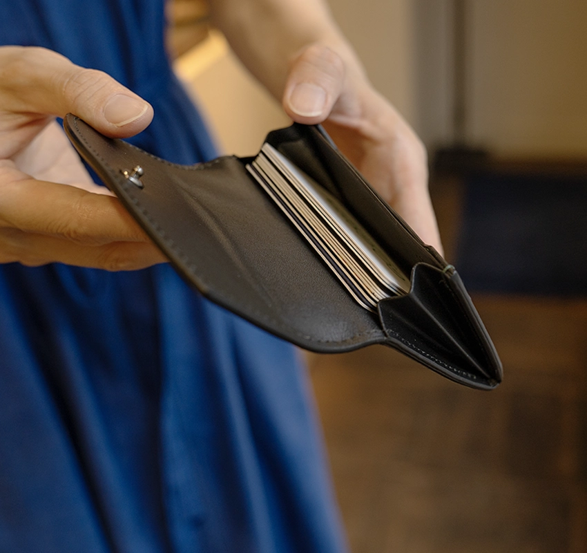 カブセにホックのついた名刺入れも珍しいが、さらにこの名刺入れの見た目を稀有なものにしているのがカブセの曲線だ。この絶妙なカーブは名刺入れそのものにゆとりを持たせてくれる。実はこの曲線、見た目のアクセントだけではなく、カブセを開ける際の指のかかりが良くなるという利点もある。ホックのある名刺入れだからこそ、指のかかりは使い勝手に繋がる重要な要素だ。見た目の美しさと機能性を兼ね備えた独特なカブセはAlt81ならではかもしれない。