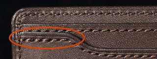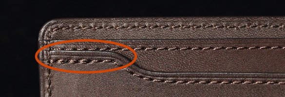 カード段の裏側:革を折り込み、ステッチを掛けている